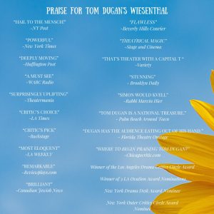 Please join us on October 27, 2022 at 7 pm at the Mandell Jewish Community Center in West Hartford for “A Night at the Theater” presenting the award winning, critically acclaimed off-Broadway show Wiesenthal performed by playwright Tom Dugan. We are thrilled to be celebrating Eliane Sandler’s contributions and commitment to Holocaust education by honoring her with this year’s L’Dor V’Dor Award. Our evening will conclude with a dessert reception following the show.